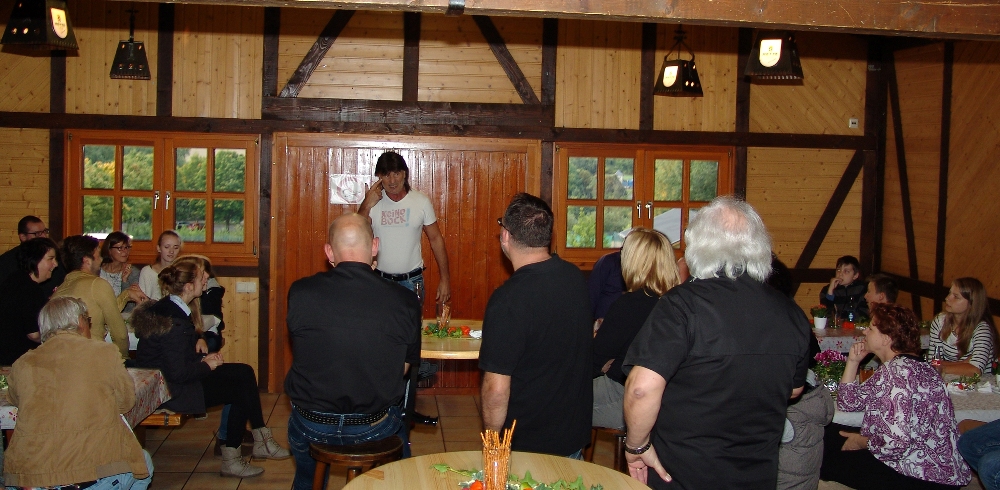 Für 18:30 Uhr hatte sich ein Entertainer der Extraklasse angekündigt. Rainer Zufall, auch als der „Kowelenzer Hejel“ bekannt, ließ es sich, trotz vollem Terminkalender nicht nehmen, dem SsTP zur Jubiläumsfeier seine Aufwartung zu machen. Mit derbem Humor und Granatengags bis zur letzten Sekunde sorgte der gnadenlose Sprüche-Terminator für Stimmung und Lachern bei Jung und Alt. Eine Wahnsinns- Show, die den Anwesenden wohl noch lange in Erinnerung bleiben wird.